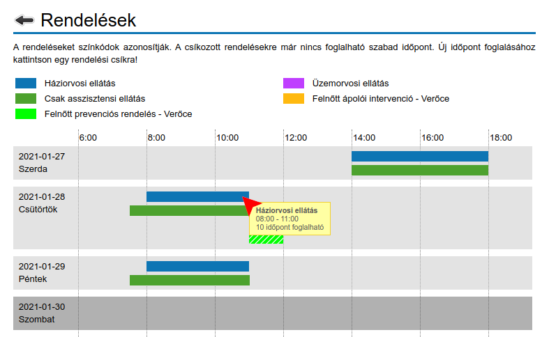 A rendelési idők egy táblázatban jelennek meg, ahol színes csíkok mutatják az egyes napokon belüli rendelési időket. Válassza ki a kívánt szolgáltatás rendelési csíkját az Ön számára érdekes nap során!