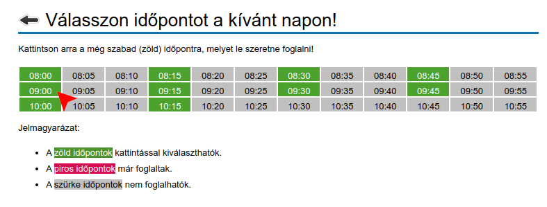 A következő oldal zöld színnel mutatja a választott napon és szolgáltatásra még lefoglalható szabad időpontokat. Válasszon ezek közül egyet!