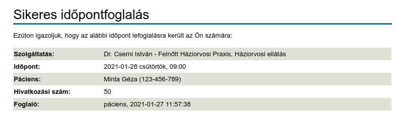 A sikeres időpontfoglalásról a rendszer az alábbi visszaigazoló képernyőn tájékoztat.