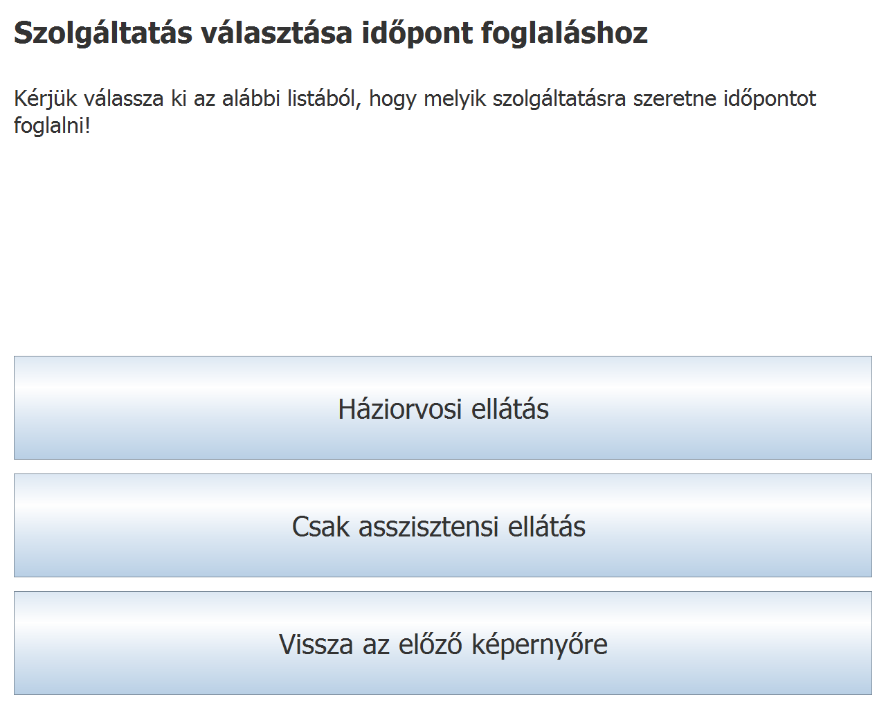 Ezen a képernyőn válassza az Időpont foglalása későbbre (minden ellátás) feliratot! Ezt követően egy újabb képernyőn van lehetősége kiválasztani azt az ellátást, amire időpontot szeretne foglalni, ahogy azt az alábbi ábra szemlélteti.