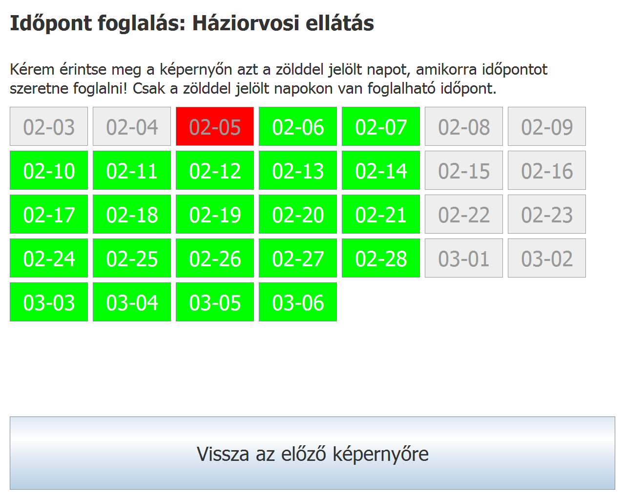 A példában a háziorvosi ellátást választjuk az ehhez tartozó felirat megérintésével. Ennek hatására megjelenik a következő 30 nap a képernyőn a következő színkódolással: a szürke napokon nincs rendelés, a piros napokra már minden foglalható időpont betelt, míg a zöld időpontokon még van foglalható hely.