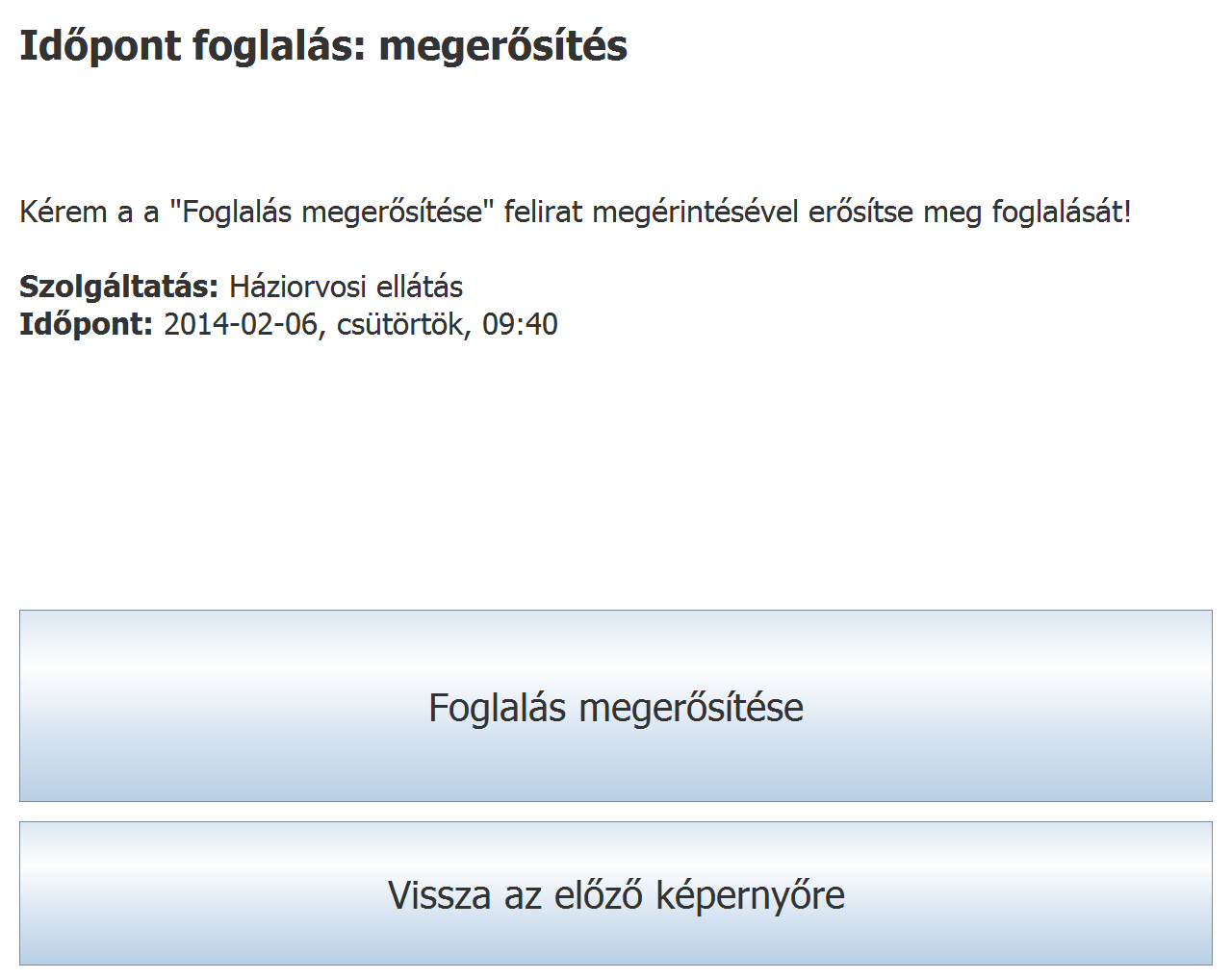 A példában a 9:40-es szabad időpontot választjuk. A felirat megérintésének hatására az alábbi megerősítő ablak jelenik meg, mely összefoglalja az eddigi választásainkat.