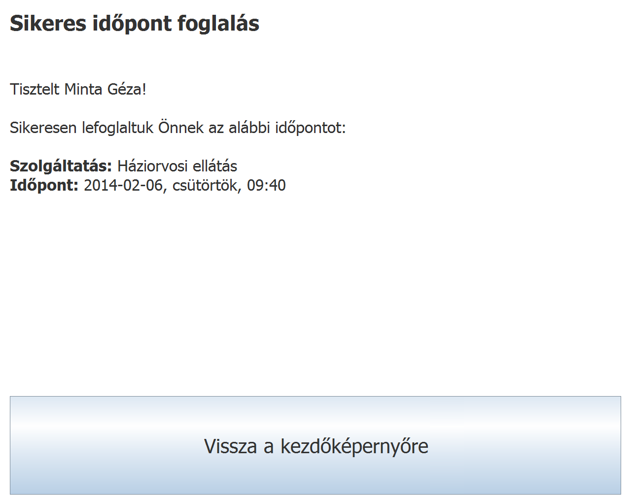Ezzel az időpontfoglalás folyamata lezárult. A továbbiakban Ön bármikor megtekintheti a lefoglalt időpontját a regisztrált páciensek webes felületén, illetve ott kérhet róla emlékeztető e-mailt, illetve szükség esetén törölheti is foglalását. A páciensek webes felületének időpont foglalással kapcsolatos használatáról itt olvashat egy lépésről lépésre tájékoztatót.